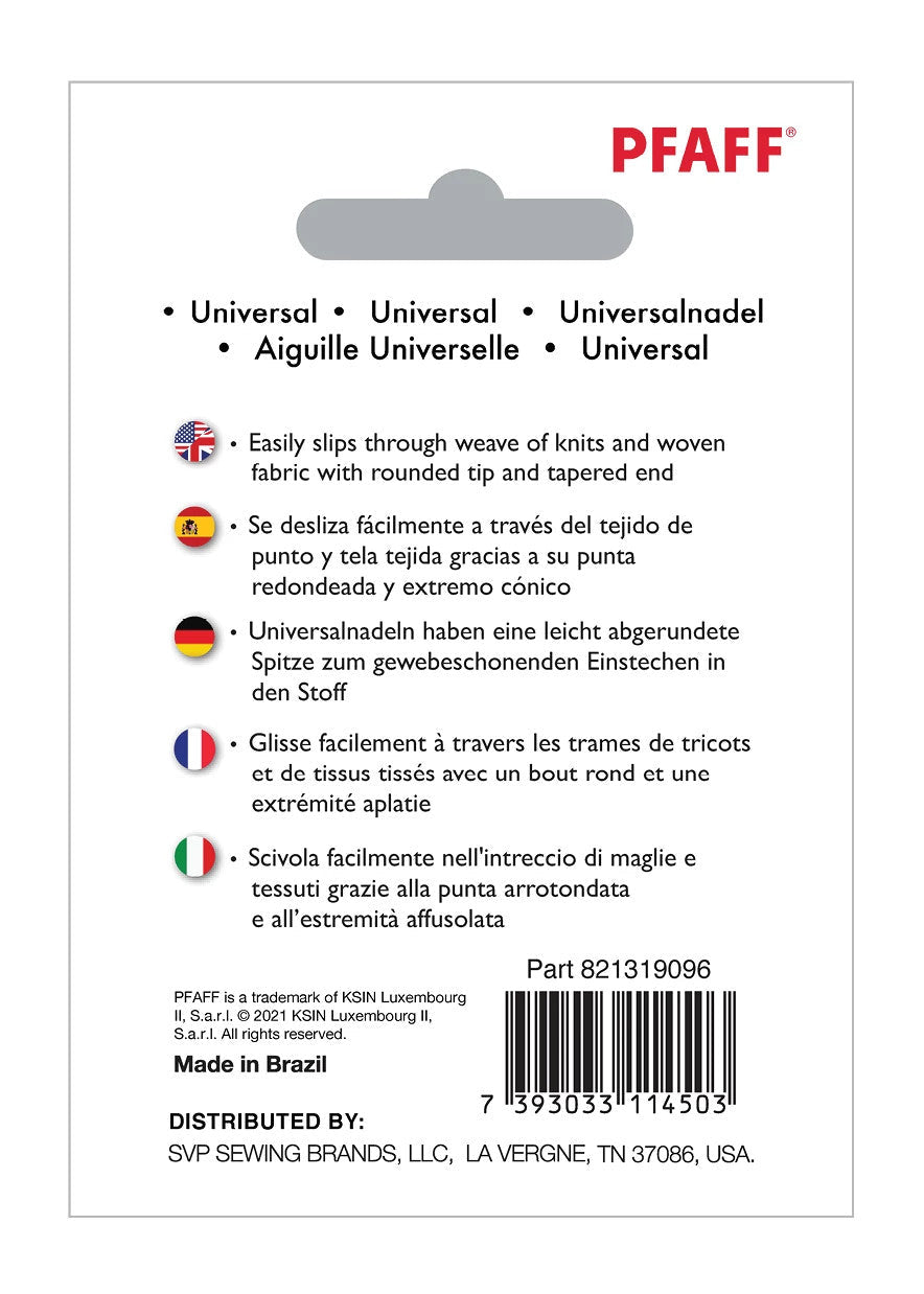 Needles Specially Designed For All-Purpose UseEasily slips through weave of light weight knits and woven fabric with rounded tip and tapered end. For optimum performance, change your needle every 6 - 8 hours of sewing and/or type of fabric.