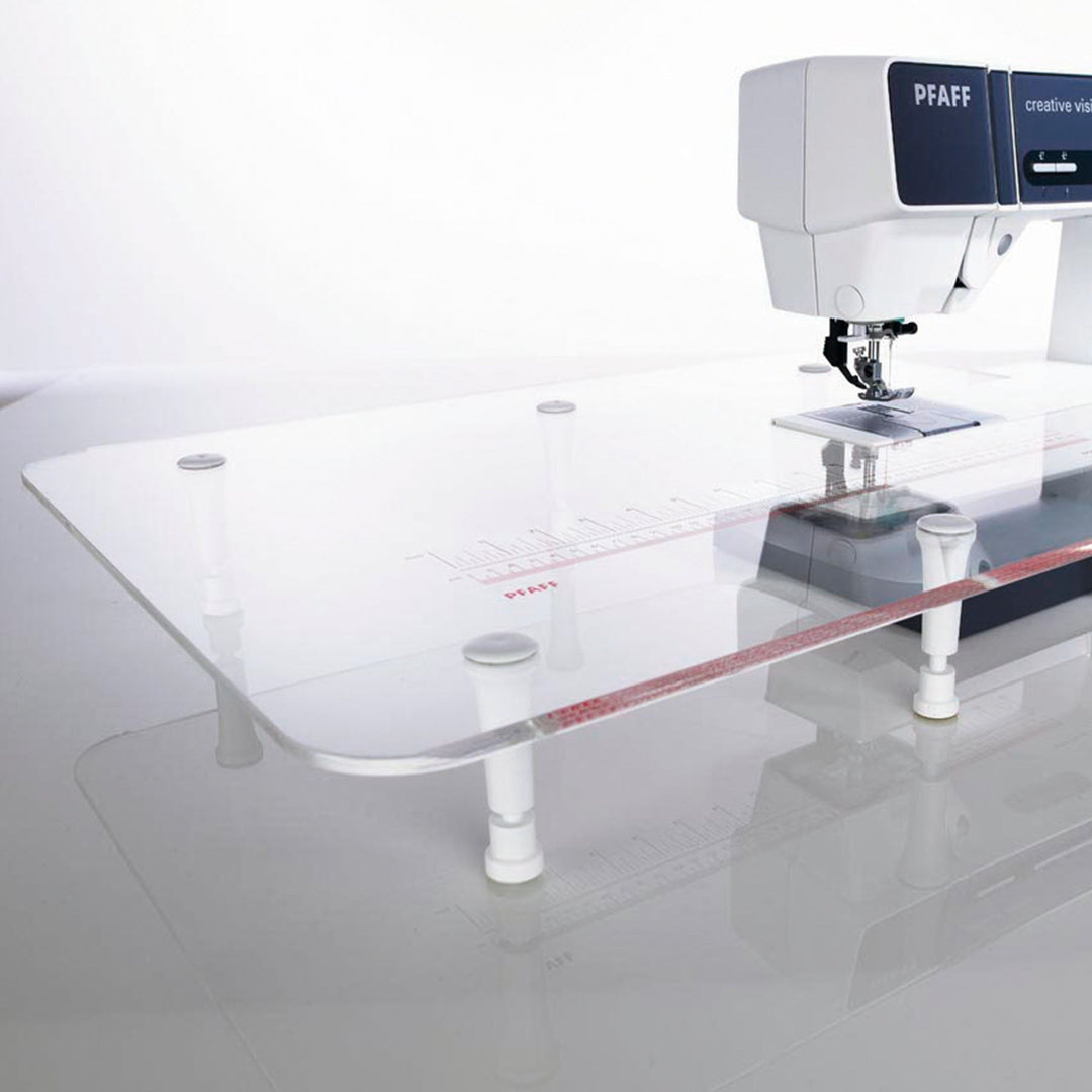 Easily Supports Large Projects With Less Drag On Your Needle Made of sturdy, smooth Plexiglass. This terrific table substantially increases your work area to accommodate the extra space quilters need. Even very large quilting projects can be handled comfortably.